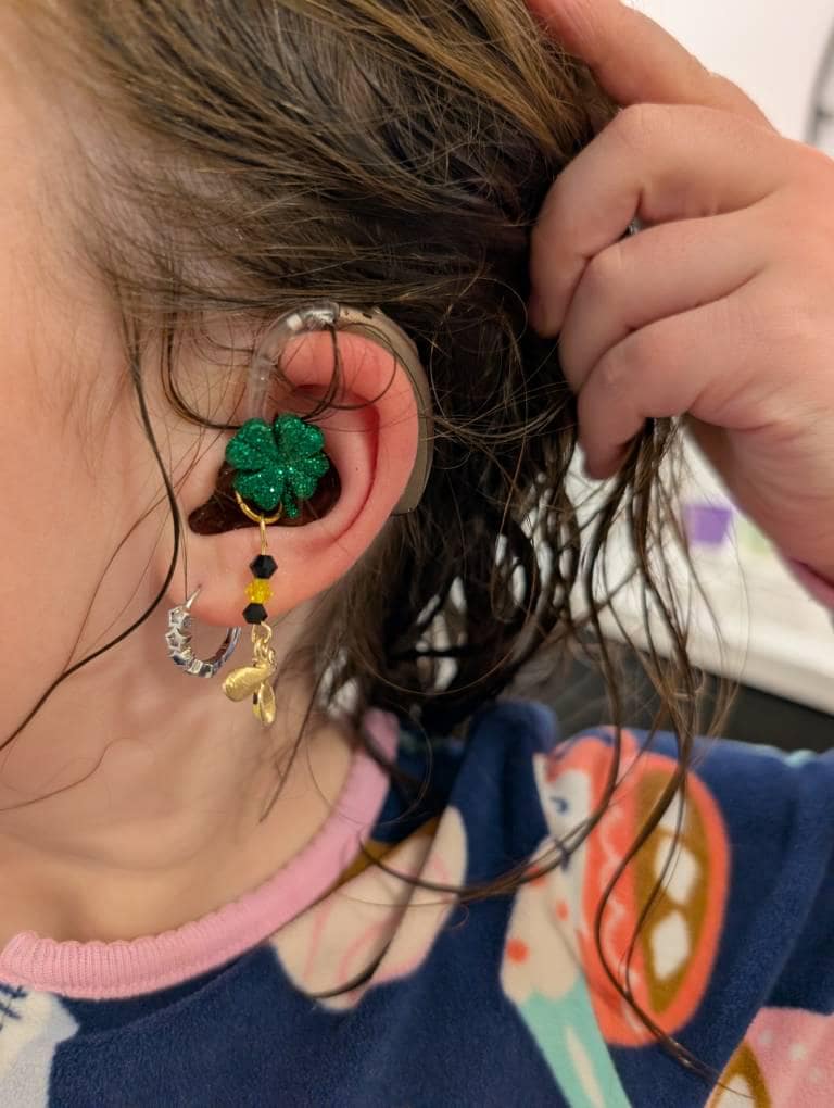 This includes one pair of earrings and one pair of charms or pair of charms (if mother and daughter both wear hearing aids). Please specify whether you'd like pierced, clip on or 2 sets of charms with this option.